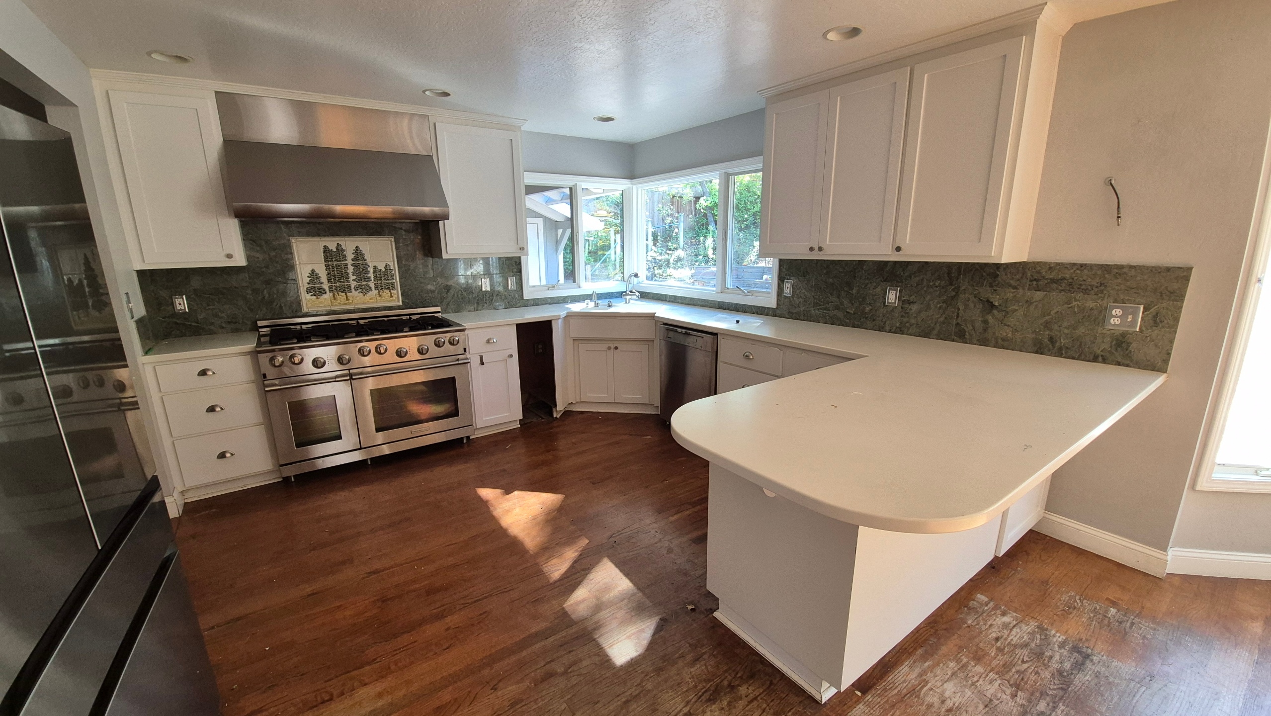Laminate cabinets with corian top. 16′ of lower cabinets, 11.5′ of upper cabinets, 48″ wide pantry cabinet. Appliances & sink are sold separately $150 (you detach and remove)