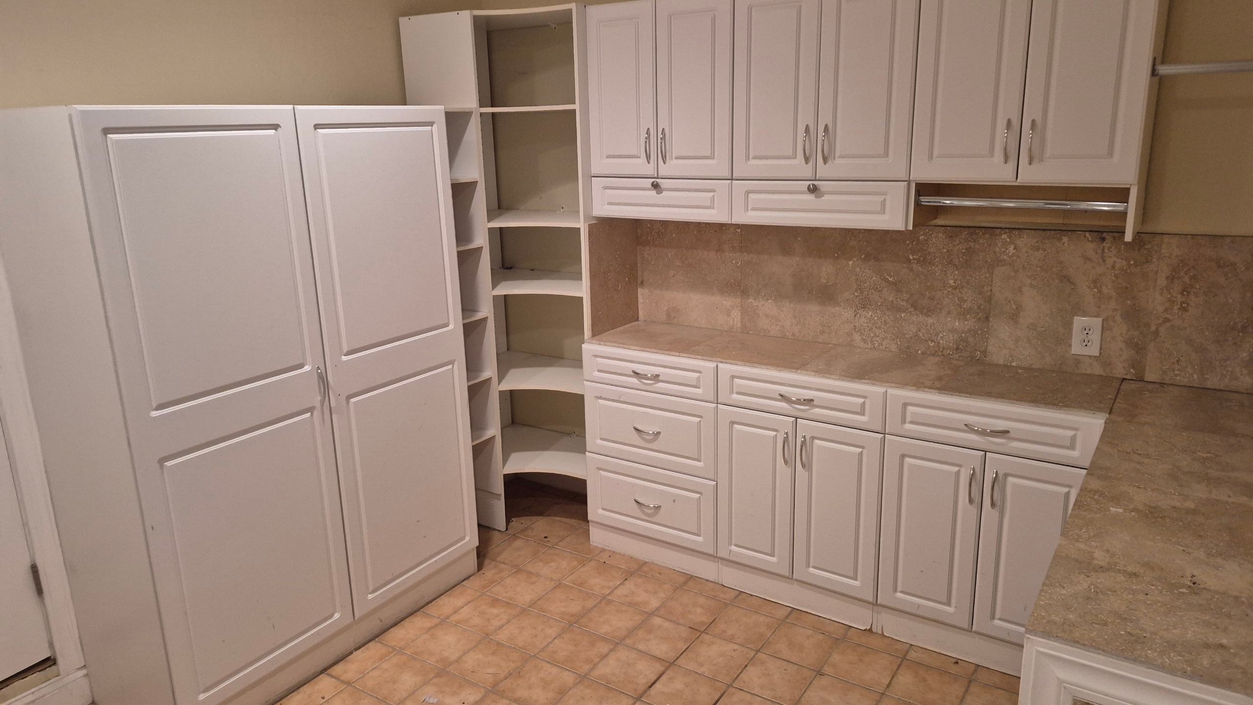 48x21x71 cabinet with doors on left$20 11×12×21 shelf next to that $10 30x20x84 corner shelf $12 71×31×12 upper cabinet $15 71×16×35 lower cabinet with tile top$30 (All you detach and remove)