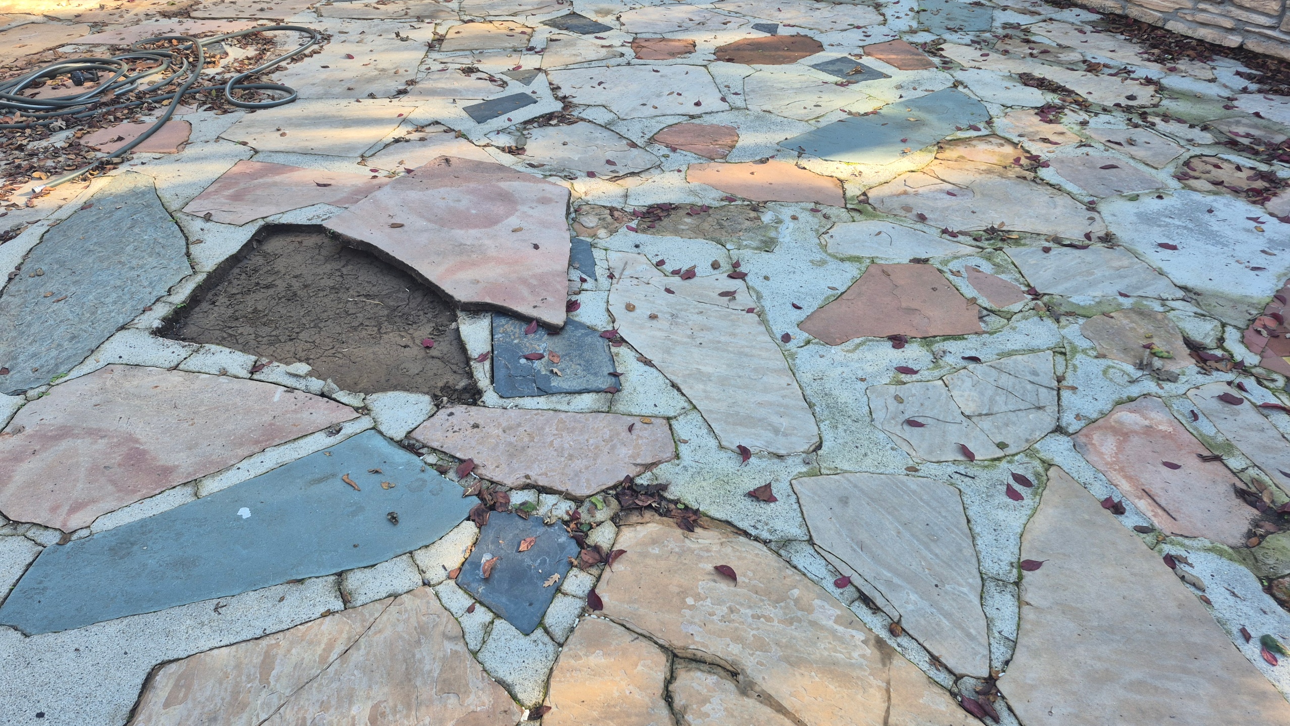 1083 sq ft of easy to pry up 1 5/8″ thick flagstone: mostly Arizona Red but other colors mixed in. The stone and mortar are laid over dirt so the stone is extremely easy to pry up. $2.25//sqft ( you detach and remove) price goes down to $2/ square foot if you buy all of it.