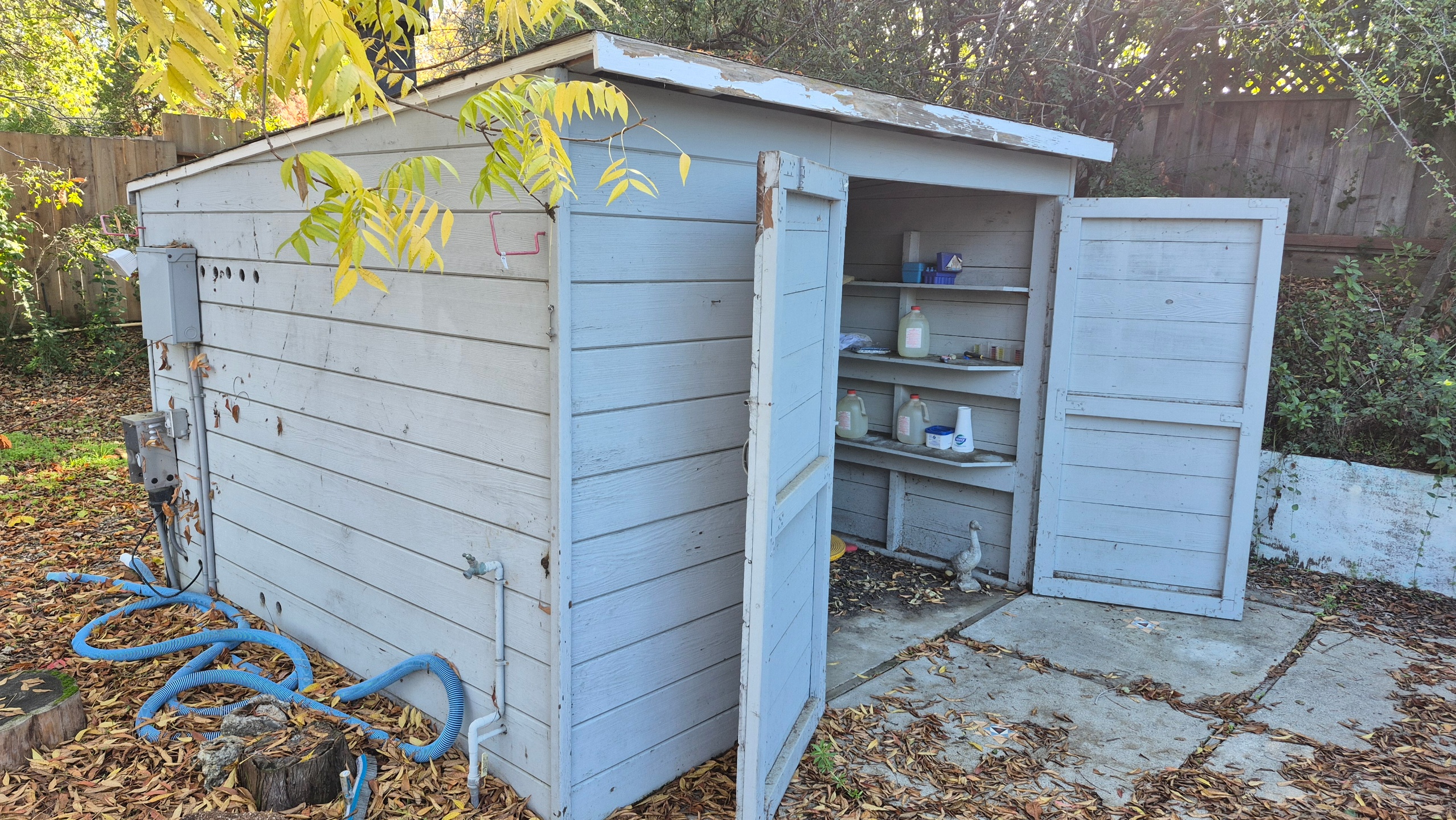 9’5″ x 10’3″ .shed with 1×7 v- rustic redwood siding. roof slopes from 85- 72. Double Doors in front are 72×77 tall. Double doors in back are 68×68 $200.( you detach and remove)