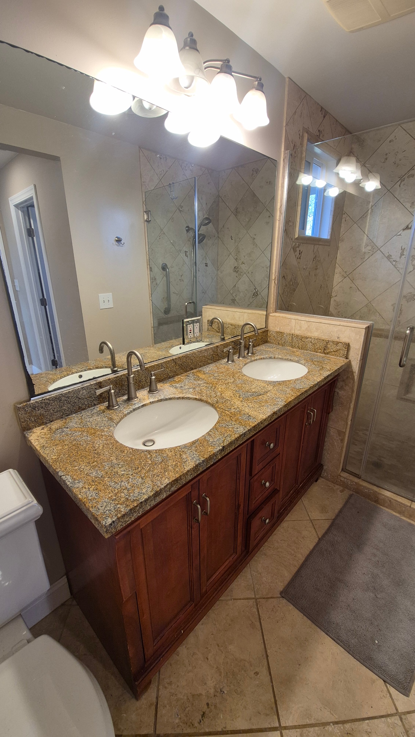 vanity light $12 63″ stone top dual Kohler sink vanity with hardware $50 (you detach and remove)