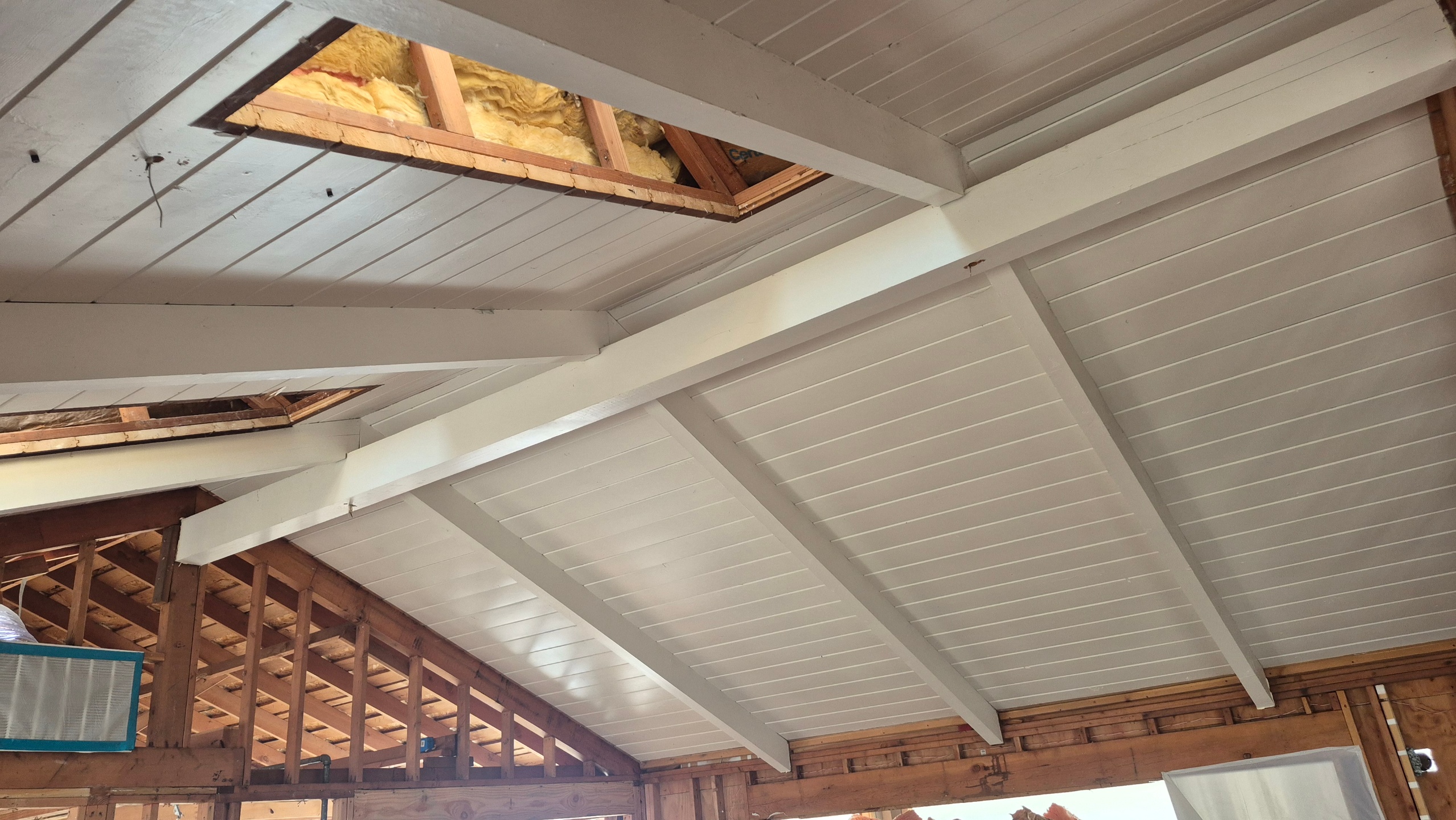 Cathedral ceiling: 19.5 ft x22 ft cathedral ceiling with 450 sq ft of 2×8 pine tongue & groove sheeting 10@ 4x8x13ft doug fir beams 4x10x19.5ft ridge beam 2 skylights sold separately $500 ( you detach and remove) $1275(we detach & remove)
