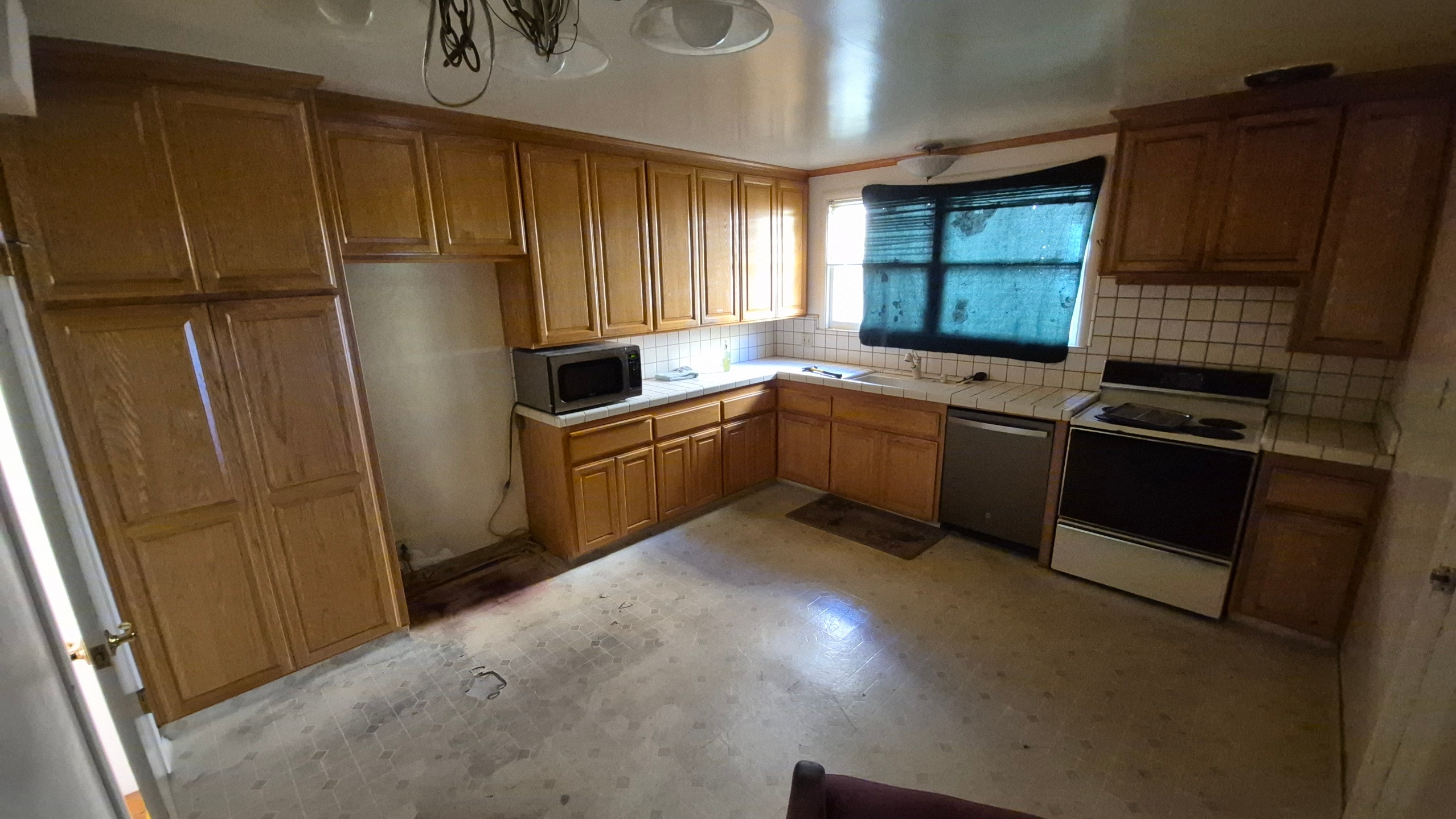 Plywood cabinets refaced with oak faceframes and doors: 15.5 ft of uppers (uppers are 44″ tall) 11+ ft of lowers & 36x21x96 pantry cabinet $60 (you detach and remove)