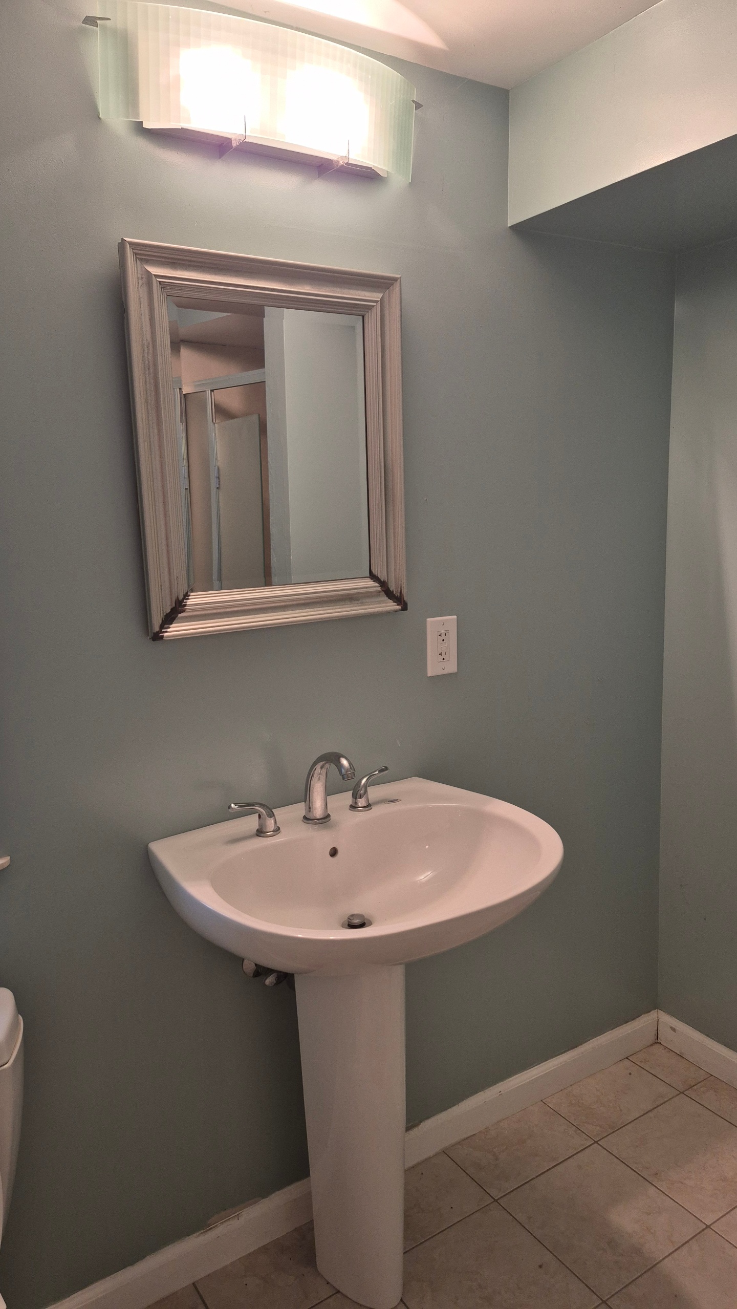 24″x 6.5″ two bulb vanity light $10; 21x 25″ mirror $5; 26″ x 21.5″ x 34″ t pedestal sink $30 (you deter and remove)