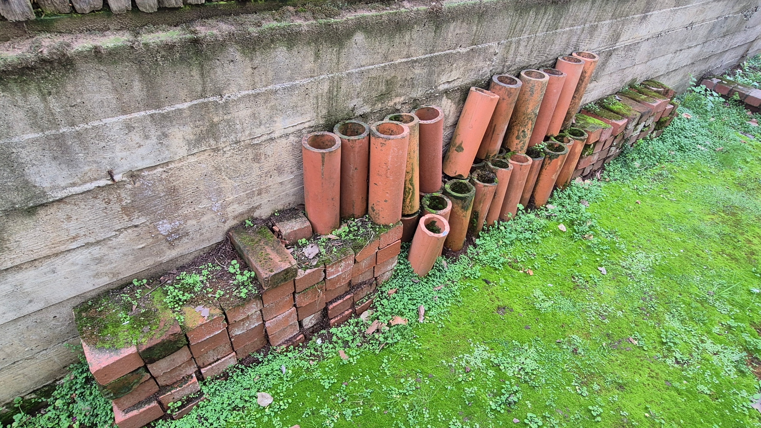 30@ 5×12 terracotta drain tiles $3ea or all $75. 80 bricks $18.