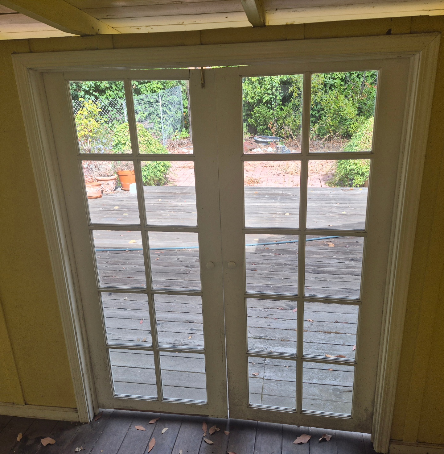 1 3/8″ x 60 x 73 single glazed true divided light, wood, french doors and jamb $50 ( you detach and remove)